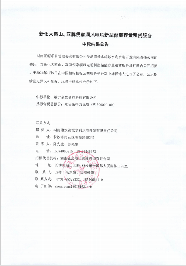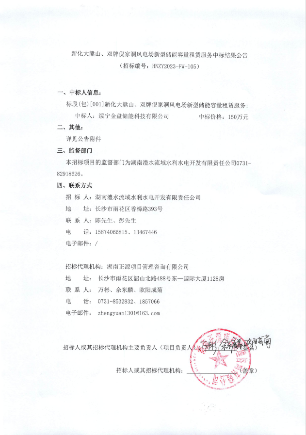 新化大熊山、雙牌倪家洞風電場新型儲能容量配置租賃服務中標結果公告 來源:企管部 發布時間:2024-01-26 瀏覽數: 次 【字體:小 大】 (本公告僅用于司務公開,以招標公告指定發布平臺為準) 【打印正文】 分享到:
